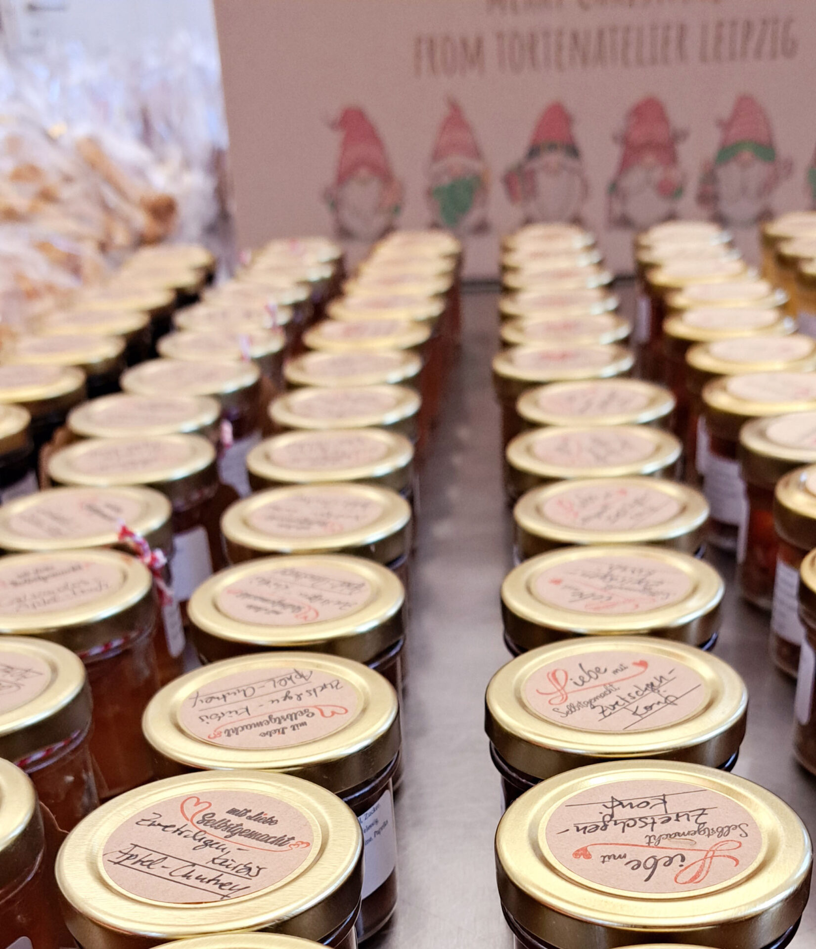 Gefüllt sind die Adventstütchen mit weihnachtlichem Gebäck, sowie Macarons, Pralinen, dekorierten Cookies, Chutneys, Fruchtaufstrichen und vielem mehr.
